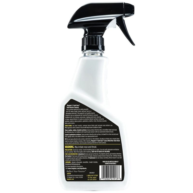 Solutie Curatare Interior Auto Meguiar's Gold Class Total Interior Cleanser 473 ml este un curățător multi-suprafață non-gras, cu formulă avansată care elimină rapid și sigur murdăria acumulată în interiorul mașinii. Formula pH-neutră emulsifică și ridică petele dificile (ulei, grăsime, machiaj, protecție solară) fără substanțe agresive. Produsul “lichid de curățare total” acționează delicat, dar eficient, păstrând finisajul natural al suprafețelor după curățare. Astfel, volanul, bordul, tapițeria, consolele și oglinzile din interior rămân curate și fără reziduuri lipicioase.